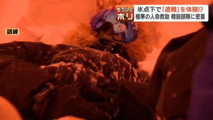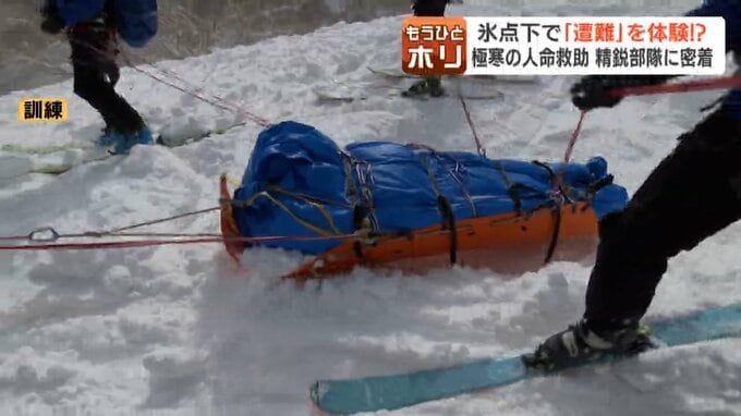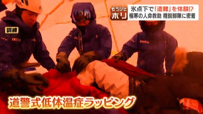 搬送には「道警式低体温症ラッピング」を導入。エアマットや断熱シート、ブルーシートなどを9枚も重ねて身体を包みます。