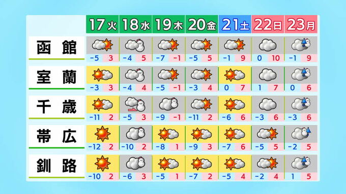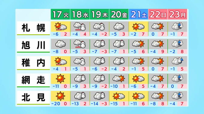 北海道地方の向こう2週間の気温は、寒気の影響を受けにくく暖かい空気が流れ込みやすい時期があるため高い日が多く、21日頃からはかなり高くなる見込みです。