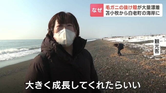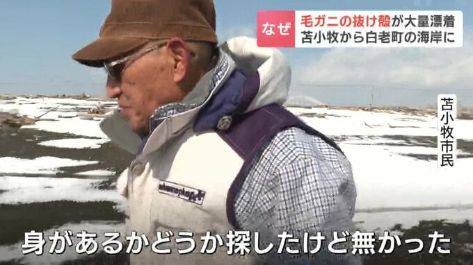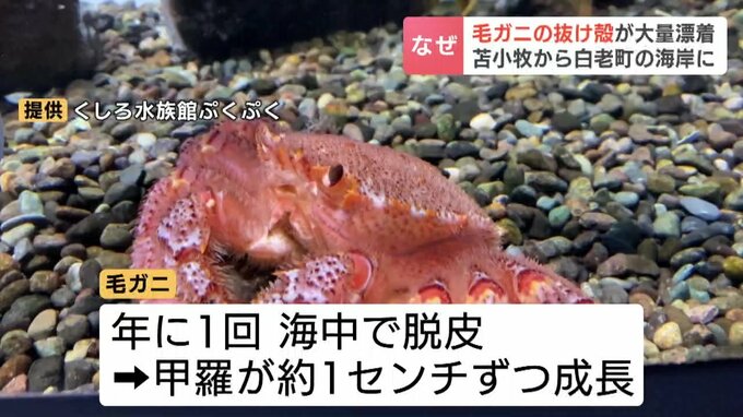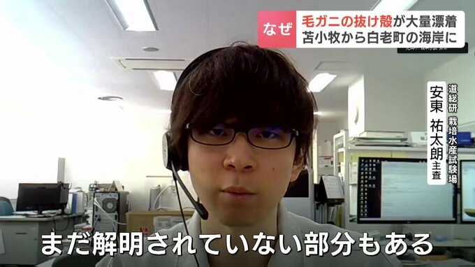 北海道苫小牧市周辺の海岸で先週、大量の毛ガニの抜け殻が見つかり、道総研が現地の調査を行い、原因を調べています。