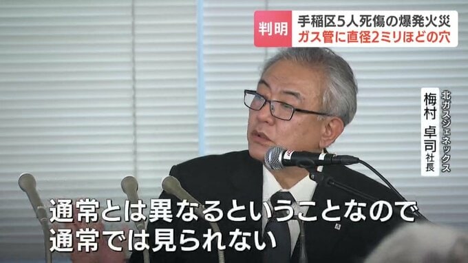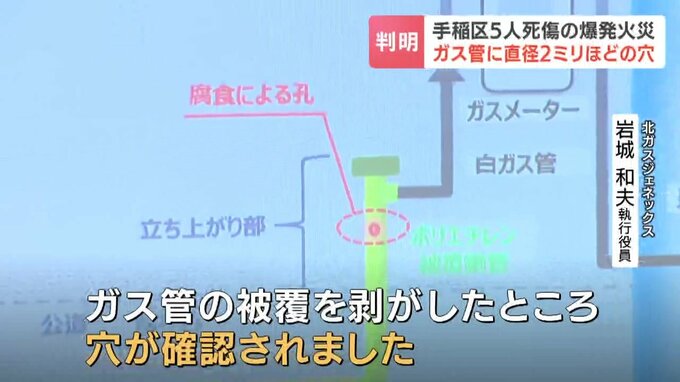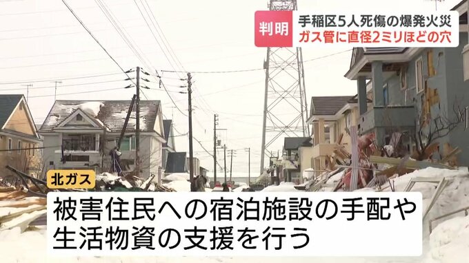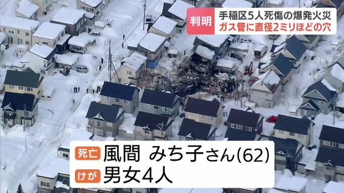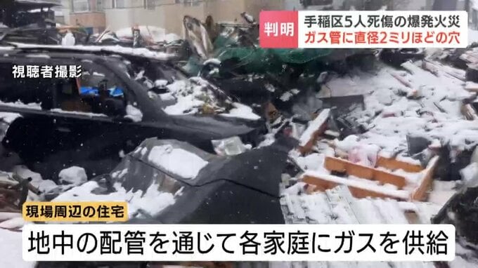 現場周辺の住宅には、地中の配管を通じてガスを供給していて、北ガスによりますと、事故後の現地調査で、住宅敷地内のガス管に直径2ミリ程度の穴が確認されたということです。