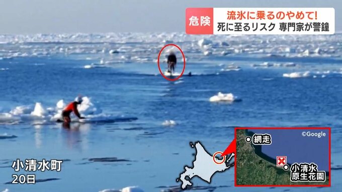 2月、北海道オホーツク海側の小清水町の海岸で、流氷に乗った男子大学生が沖に流され救助されました。命に関わる危険な行為だとして専門家が警鐘を鳴らしています。