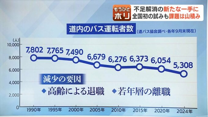 北海道バス協会によりますと、道内の加盟社に所属するバス運転手の数は、5300人ほどで、ピークだった1993年から3割ほど減っています。