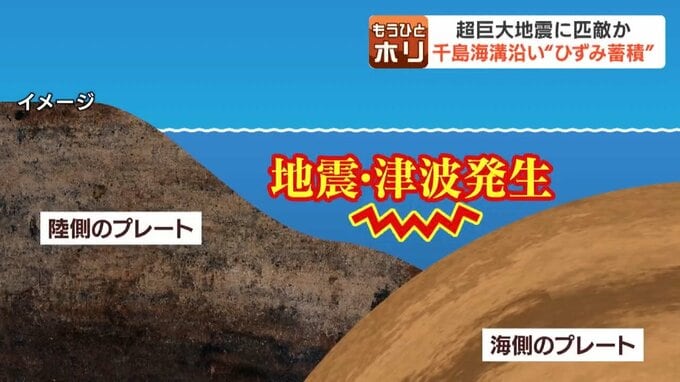 千島海溝沿いの太平洋プレートが、陸側のプレートの下に沈み込むことで起こる「ひずみ」。この蓄積された「ひずみ」が解放されることで、地震と津波が発生します。