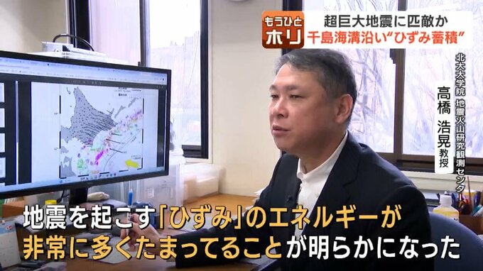「今回の調査結果から北海道の特に根室沖の領域では次の巨大地震に向けて、地震を起こす「ひずみ」のエネルギーが非常に多くたまってることが明らかになった」