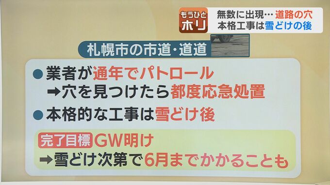 札幌市の『市道・道道』の場合ですが、道路を見回る委託業者が通年でパトロールしていて、穴を見つけたら、その都度応急処置しています。