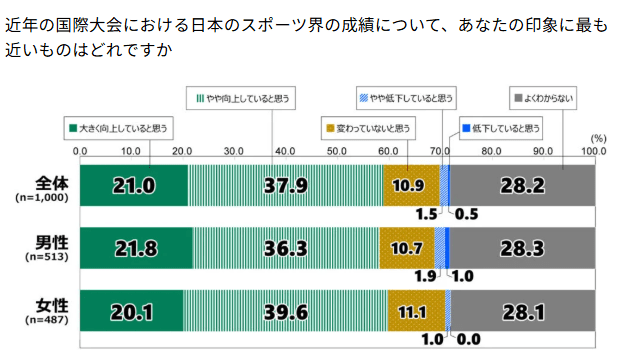 一方、国際大会における近年の日本のスポーツ界の成績については、「大きく向上していると思う」「やや向上していると思う」を合わせて約60%が肯定的な評価を示した。