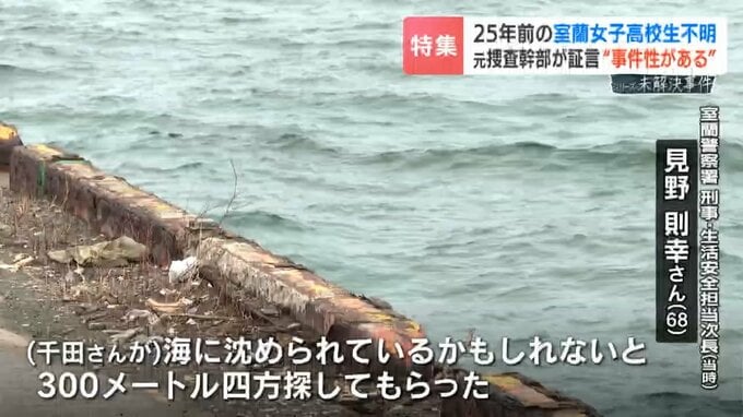 「室蘭警察署管内で暴力団が金庫を盗んだ事件があって、ボトボトと(海に捨てた)。回収する作業で機動隊が動いた。(千田さんが)海に沈められているかもしれないと300m四方探してもらったこともありました」