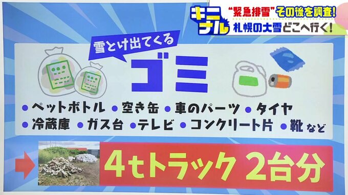 雪解け後に出てくるゴミが問題になっています。ペットボトルだけでなく、タイヤや冷蔵庫が出てくることもあるそうです。
