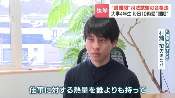 スキー全国王者から司法試験合格へ 札幌学院大4年生・村瀬裕矢さんが超難関を突破した「手作り教材」と「10時間睡眠」…驚きの勉強法とは? 2026年3月6日(金) 20:15 国内 村瀬裕矢さんの描く将来は? 札幌学院大学(4年)村瀬裕矢さん 「仕事に対する熱量を誰よりも持って、依頼者にも信頼される、一目置かれる弁護士になりたい」 弁護士を目指す村瀬さん。再来週からは、司法修習が始まります。