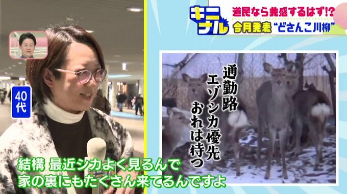 【北海道あるある】「〇〇は パンツと同じ はくものだ」〇〇に入るのは?北海道の常識が詰まったどさんこ川柳 入賞作品に共感の声続々 2026年3月9日(月) 19:00 国内 40代女性が、明日は我が身と感じた川柳 『通勤路 エゾシカ優先 おれは待つ』 40代女性 「あすは我が身だなっていう気がして…結構、最近シカよく見るんで、家の裏にたくさんシカいるんですよ。毎朝、見ます」