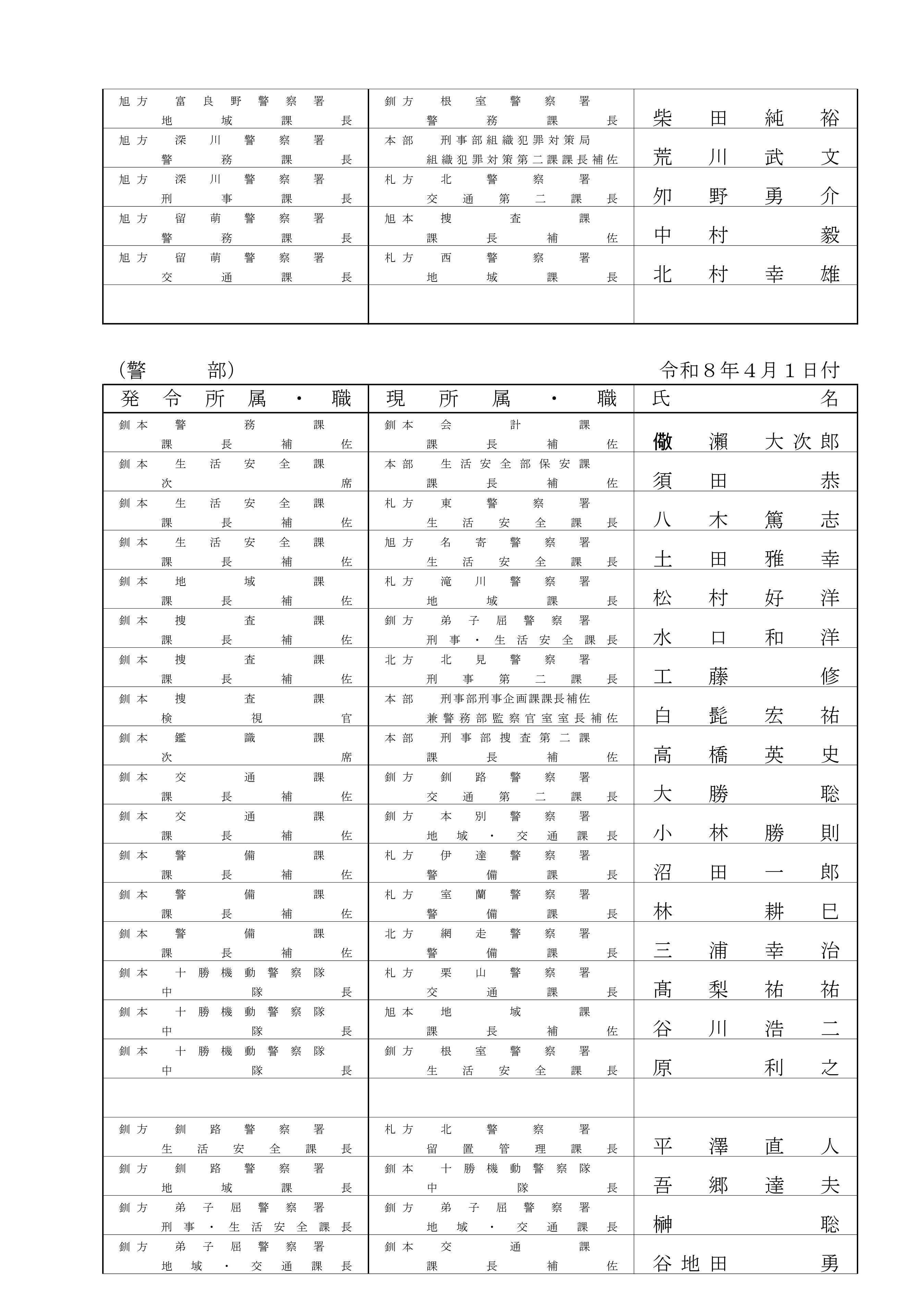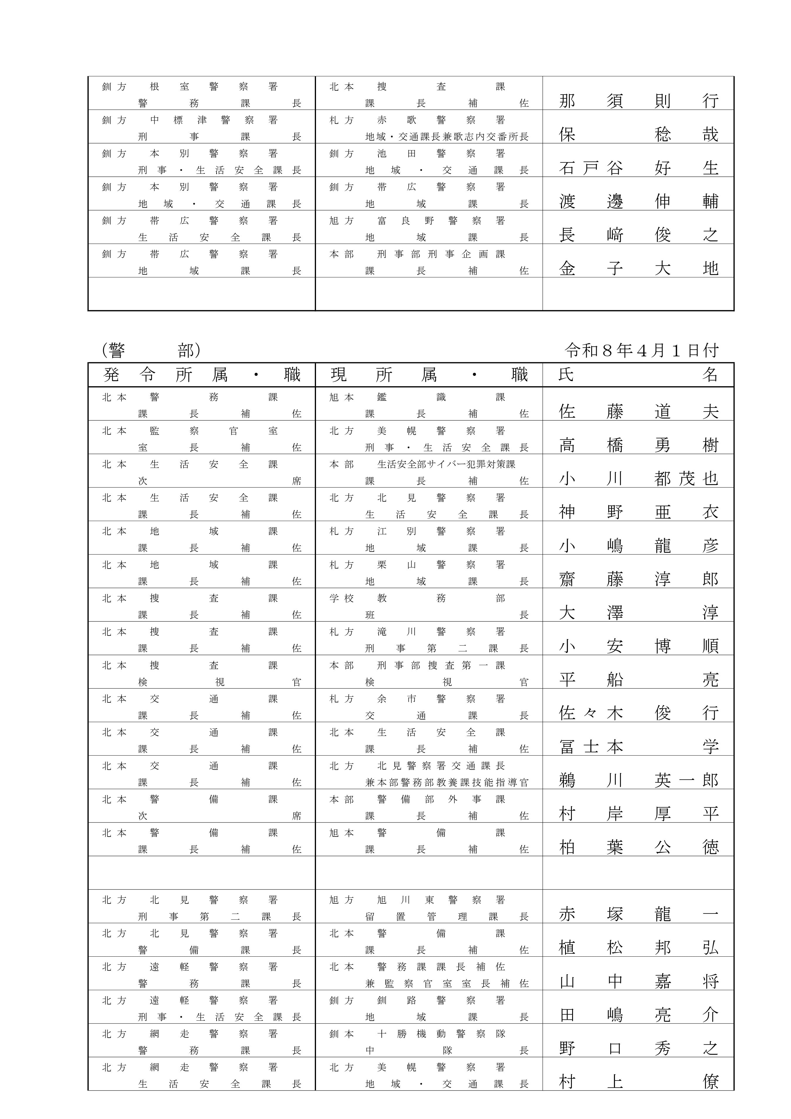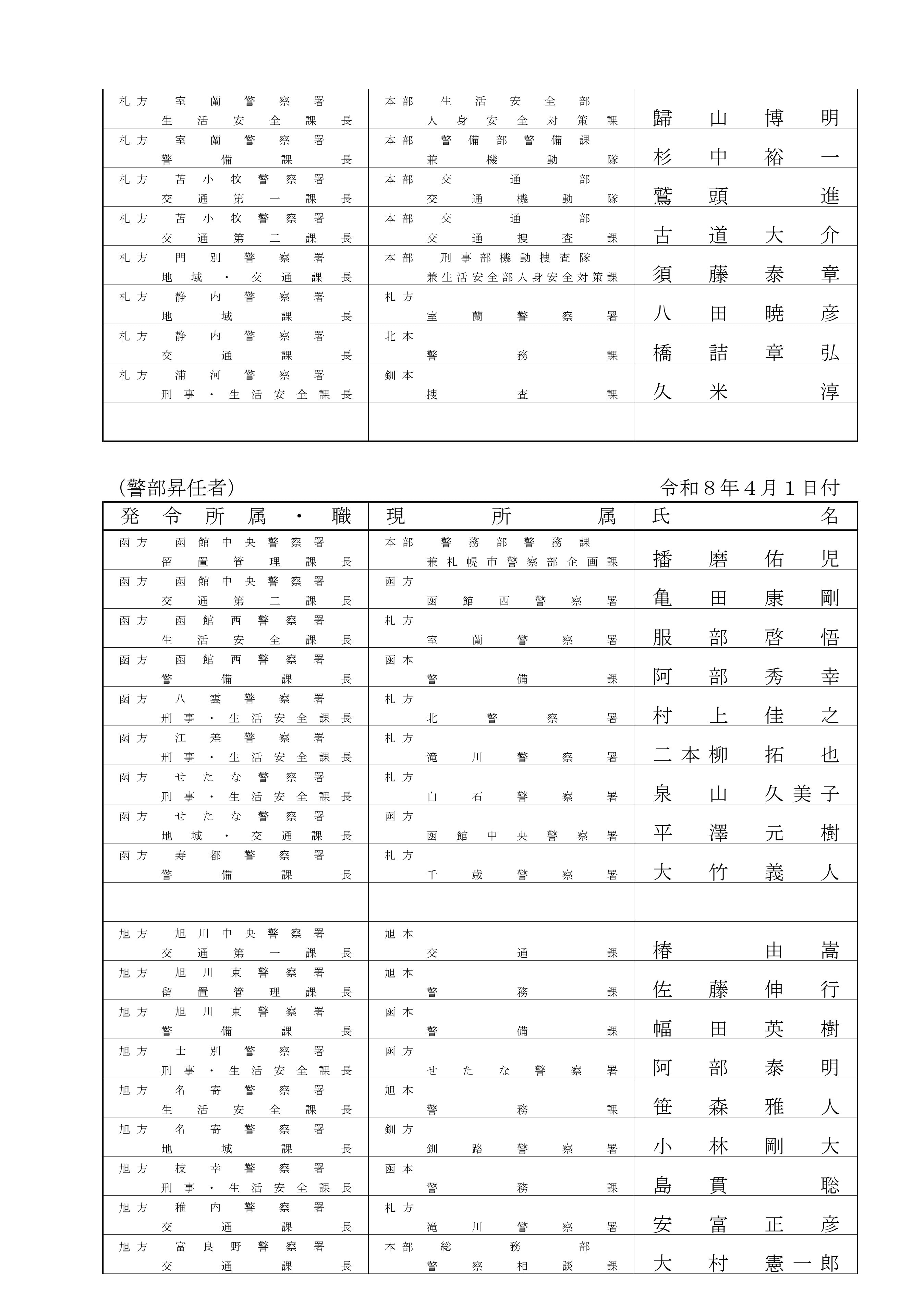 【北海道警察】人事異動2026 警部(相当職)一覧