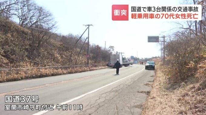 17日午前、北海道室蘭市の国道で軽乗用車やトラックなど3台が関係する事故があり、軽乗用車を運転していた78歳の女性が死亡しました。