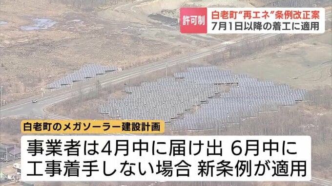 【メガソーラー建設】北海道白老町が「許可制」導入 全員賛成で19日可決 7月以降に工事着手する事業者には新条例適用 2026年3月19日(木) 17:35 国内 メガソーラーの建設計画が相次いでいる北海道白老町の町議会は19日、建設を許可制とする条例の改正案を可決しました。19日、白老町議会ではメガソーラーの建設計画を抑制するため、町が条例の改正案を提案しました…