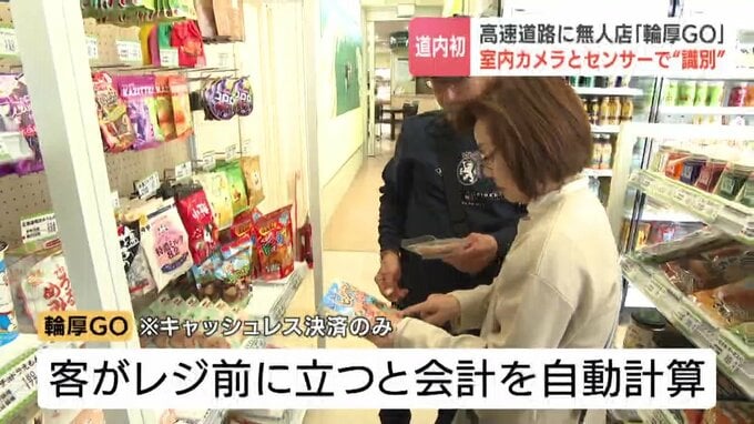 「すごい!」北海道初…高速道路PAに無人販売店『輪厚GO』商品を持ってレジ前に立つだけで会計表示 ネクスコ「革新的なお買い物体験を」 2026年3月24日(火) 18:10 国内 道央自動車道の輪厚パーキングエリアに、高速道路では北海道で初めてとなる無人販売店がオープンしました。三栗谷皓我記者「きょうオープンしたこちらの店、中に入ってみますと、天井にはカメラが、そして商品棚に…