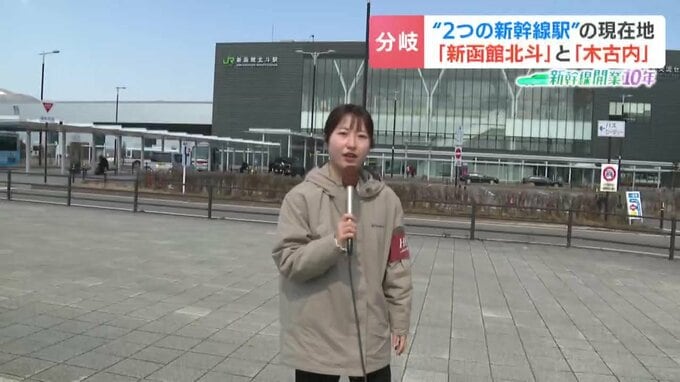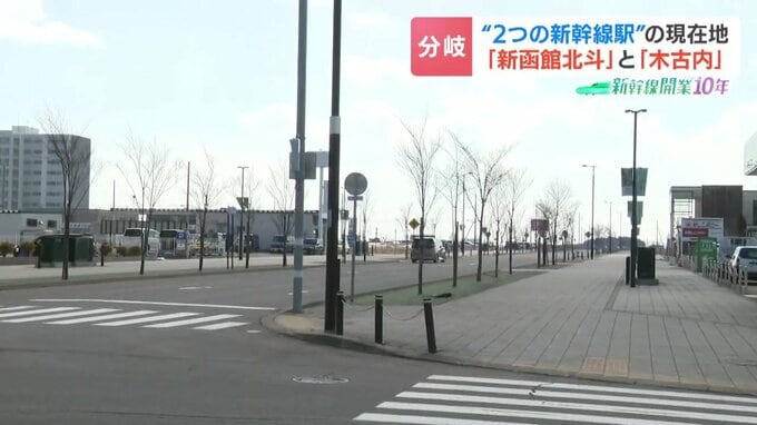 【北海道新幹線】開業10年…新幹線駅の"現在地" 「新函館北斗」は乗客約8割が乗り換えだけ、「木古内」は“塩パン”でドライブ客激増 札幌延伸へ試されるマチの知恵 2026年3月24日(火) 20:15 国内 新函館北斗駅前は…10年前と変わらず 麻原衣桜記者 「駅の目の前にはホテルはあるものの、周辺の景色は10年前と比べ、大きな変化はありません」 北海道新幹線の開業で、かつての田園地帯は駅前の一等地になりました。 しかし、再開発地区はまだ空き区画が目立ちます。
