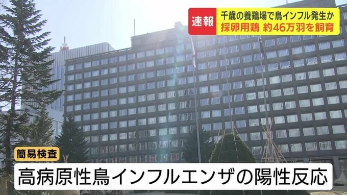 北海道千歳市の養鶏場で"鳥インフル"疑い 遺伝子検査で「高病原性」と確認されれば、今季北海道で5例目 2026年3月24日(火) 18:50 国内 24日、北海道千歳市の採卵用の養鶏場で鳥インフルエンザウイルスに感染した疑いのあるニワトリが確認されました。北海道などの関係者によりますと、千歳市の採卵用の養鶏場ではニワトリが死んでいるのが見つかり、2…