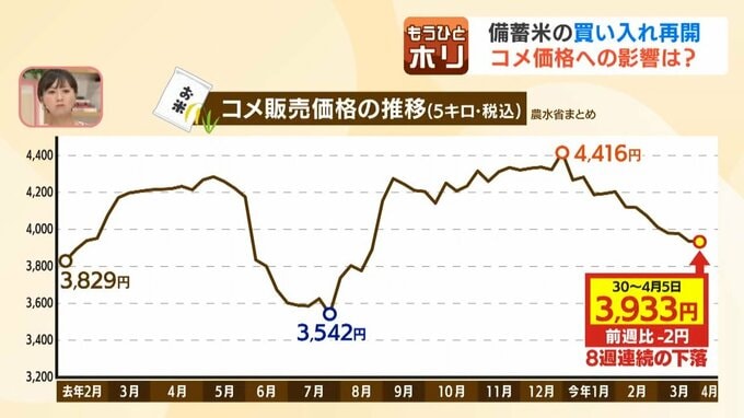 今月5日までの1週間に全国のスーパーで販売されたコメ5キロあたりの平均価格は3933円。8週連続で値下がりしています。