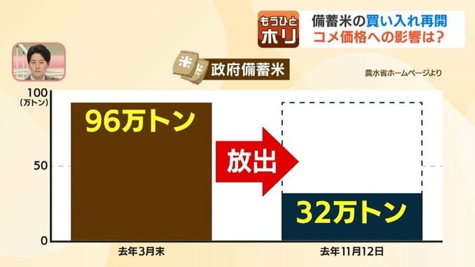 不作などに備えて、国がおよそ100万トンを保管する、いわば”国民の非常食”ですが、去年の放出で32万トンほどに減っていました。そこで…