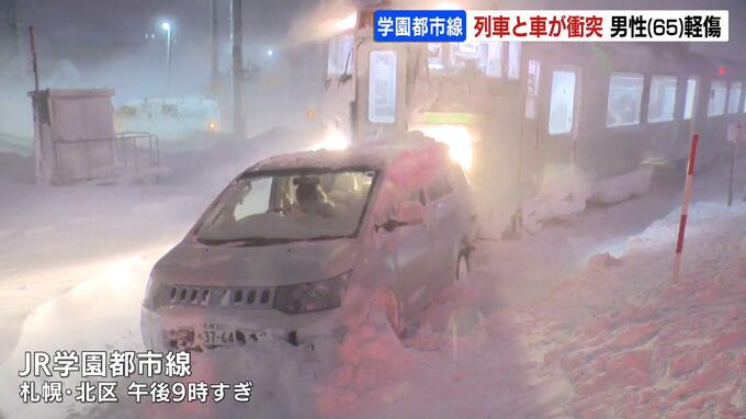 吹雪の中、踏切で動けない乗用車に列車が衝突、65歳男性が軽傷 学園都市線が運転見合わせ 札幌市北区 2023年1月26日(木) 00:18 国内 25日夜、札幌市北区の踏切で、列車と乗用車が衝突し、乗用車を運転していた65歳の男性が軽いけがをしました。 25日午後7時すぎ、JR学園都市線の拓北駅と篠路駅の間にある踏切で、普通列車が線路上で動けなくな…