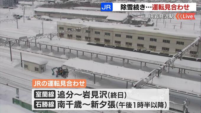 線路の除雪作業などで、JR室蘭線の一部区間など運転見合わせ 運休23本 2023年1月27日(金) 12:17 国内 JRは、27日も除雪作業などのため、一部の路線で運転を見合わせています。 JRは、線路の除雪作業などを行うため、室蘭線の追分・岩見沢間が終日、石勝線の南千歳・新夕張間は午後1時半以降、運転を見合わせま…