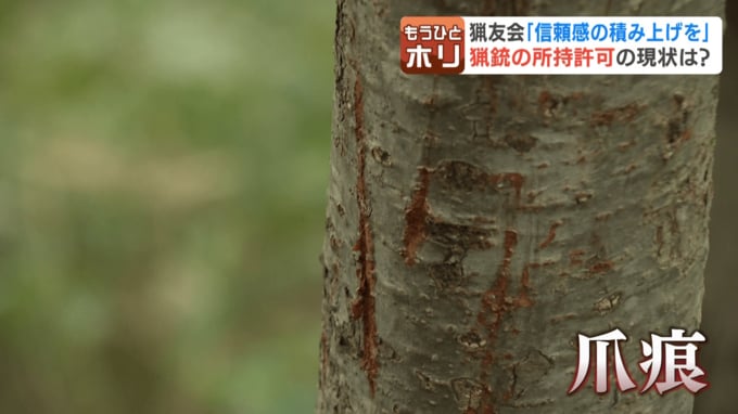 一方、こちらは、28日の札幌市南区の白川地区。道内で相次ぐクマの目撃情報に、クマよけの笛を吹きながら山の中をパトロールする猟友会のメンバーです。登山道のすぐ近くの木の幹には、子グマとみられる爪痕が刻まれていました。