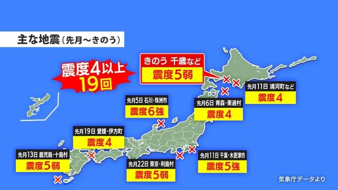先月から11日までに、石川県で震度6強など、全国で震度4以上の地震が、実に19回もありました。