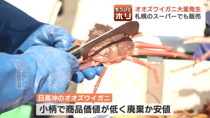 名前は「オオズワイガニ」というものの、今、日高沖でとれるカニはサイズが小さく、商品価値が低いため、廃棄するか安値で売るしかないのが現状です。