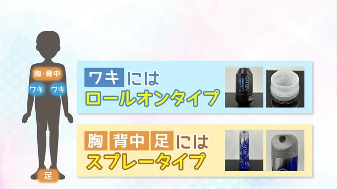 さらに、ワキにはロールオンタイプ、胸や背中、足など広い場所にはスプレータイプなど、部位によって使い分けるといいということも教えてくれました。