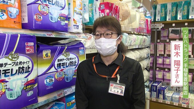 「ちょっとした尿もれでお悩みの方で尿ケア用品を購入される方、若い方も男女共に増えています。いつもの下着につけて使う尿取りパッドが、種類が多く出ています」