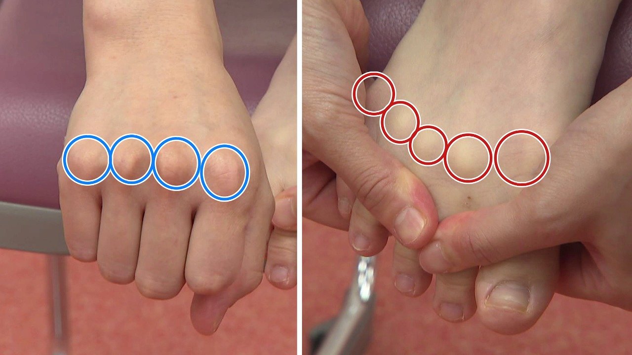 足のこぶしが出ずらい方がいるかもしれませんが、足のこの関節の部分から指をのばすようにしてください。