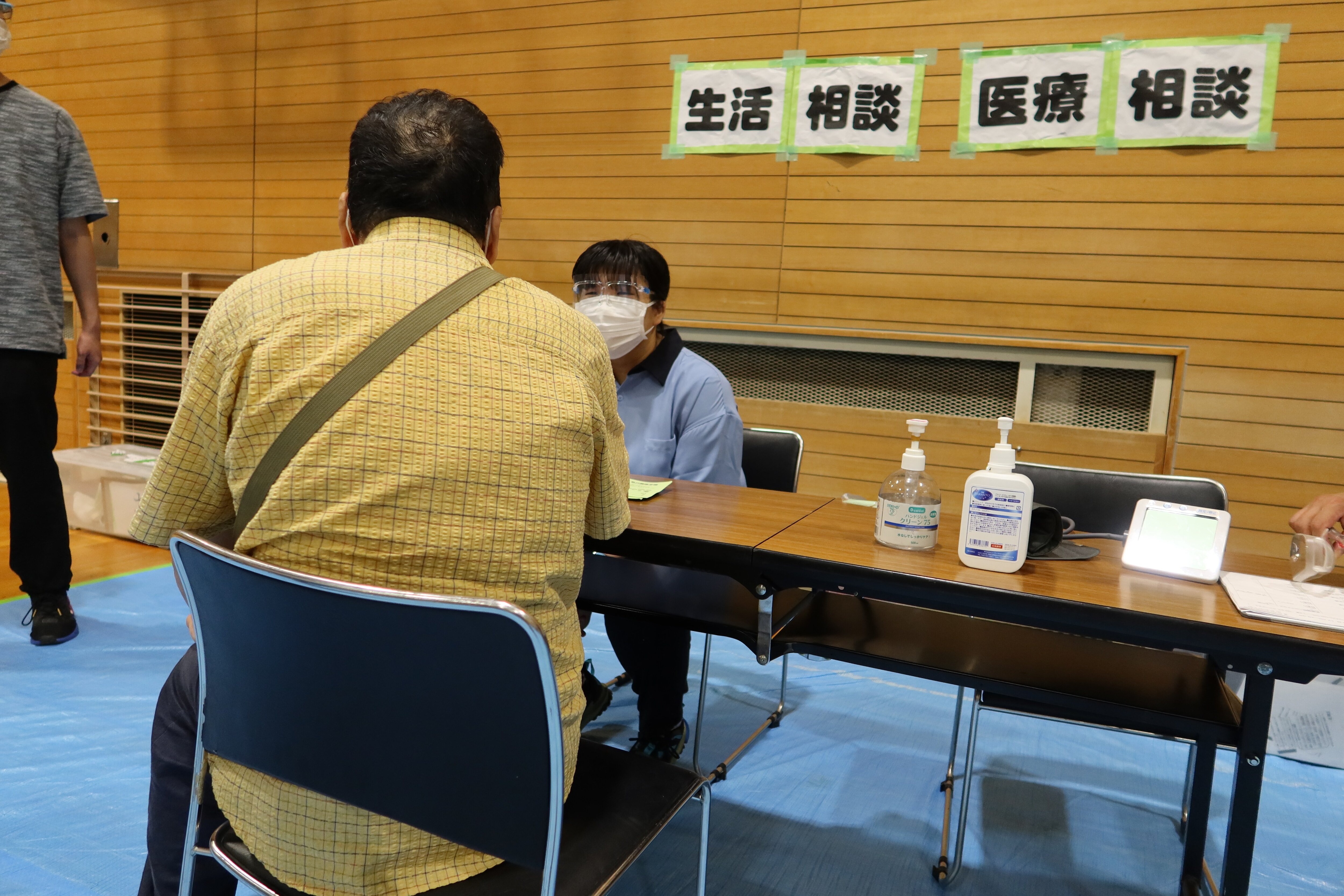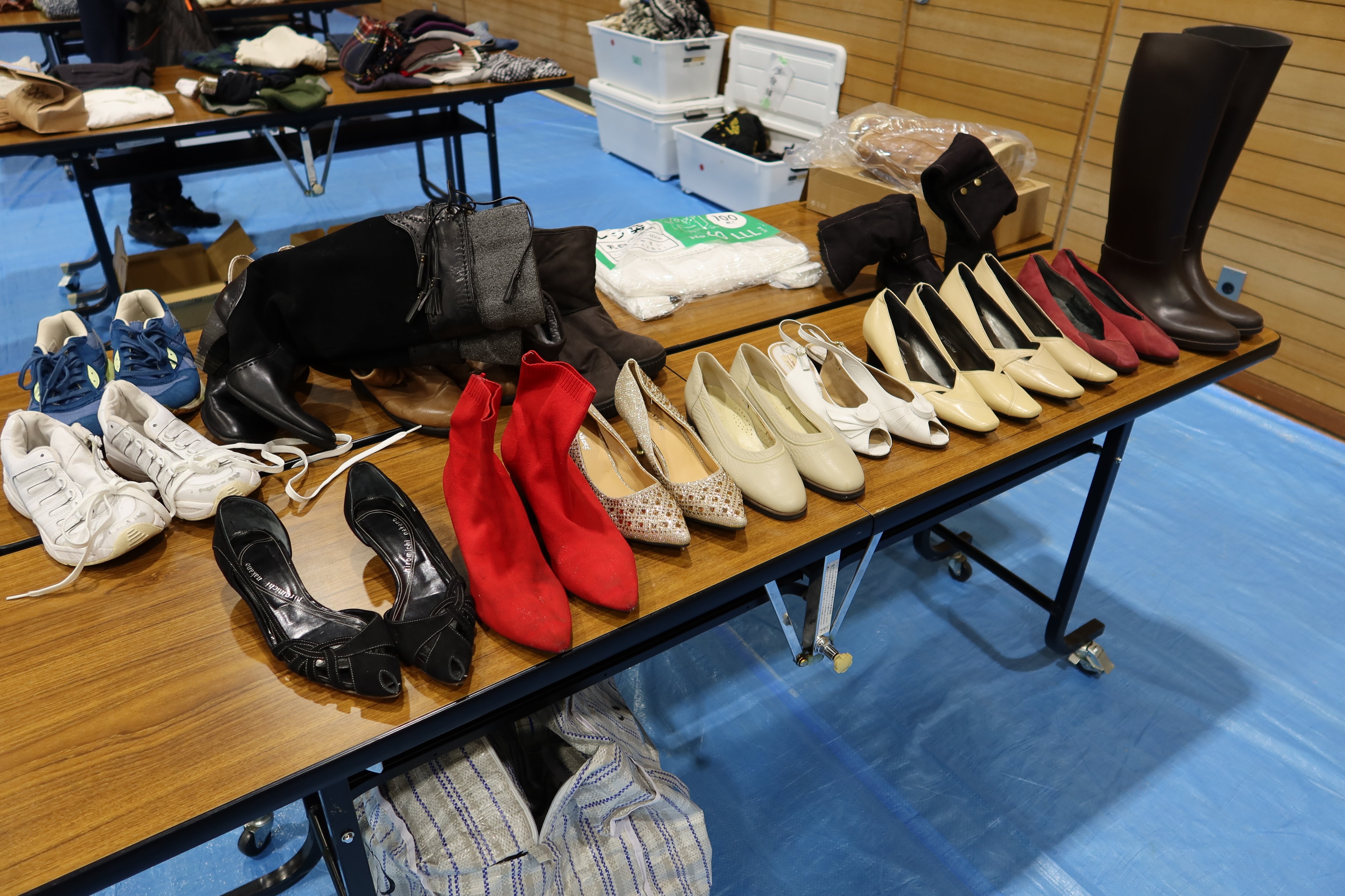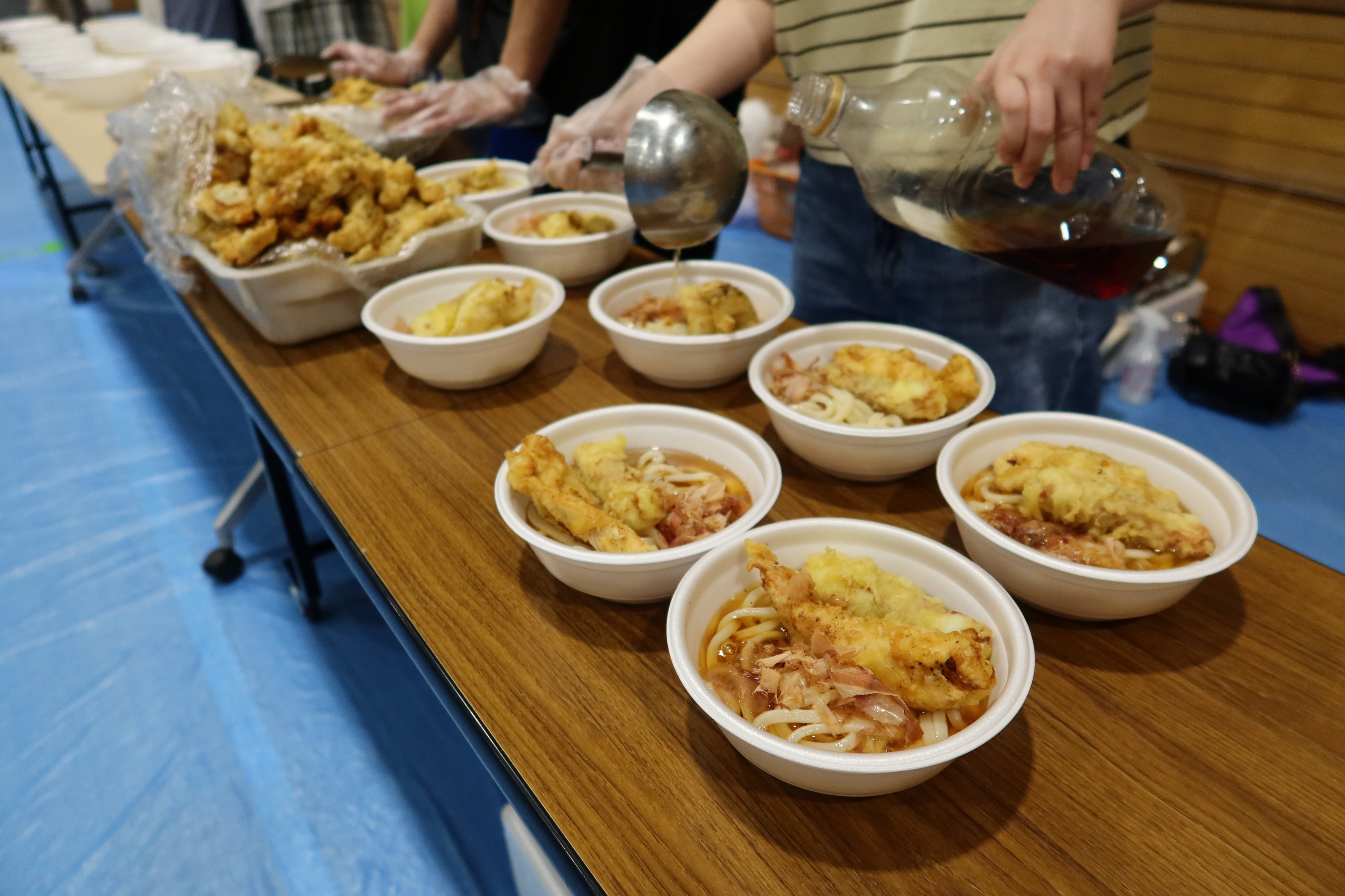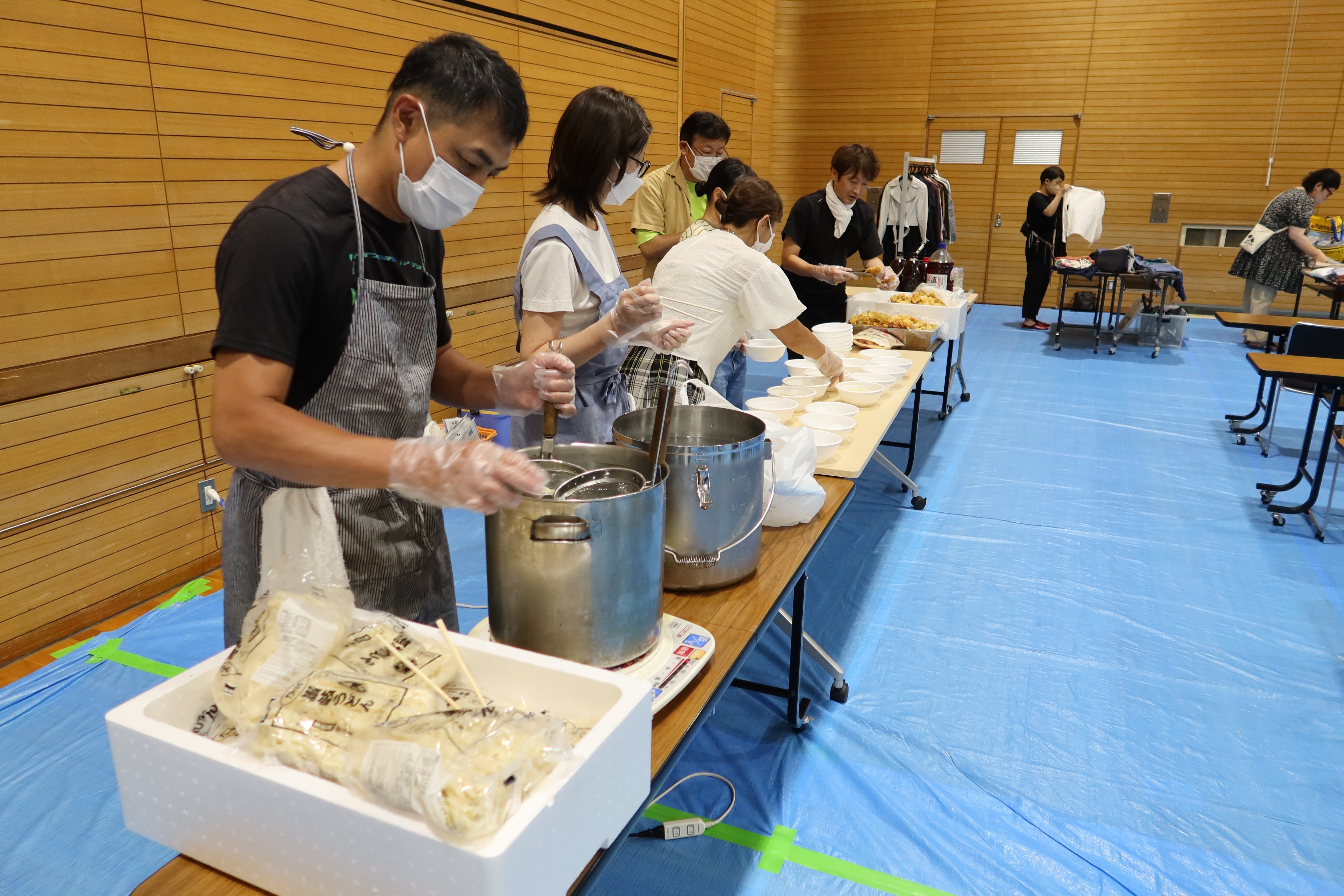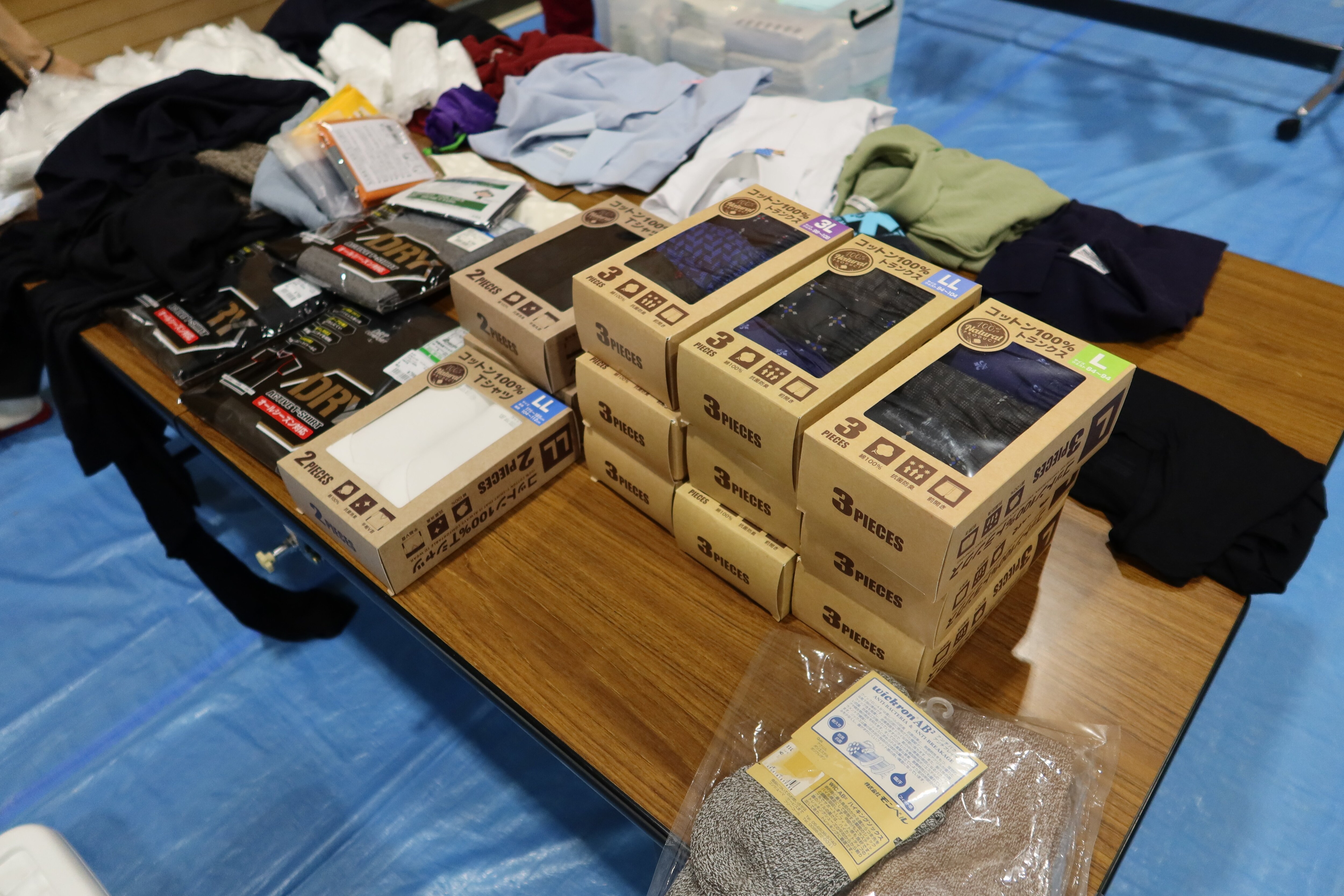 会場に並べられたものは多種多様です。カップ麺、ペットボトルの飲料水、入浴券、靴、下着、衣類、そしてボランティアの人たちが手づくりした冷やしうどん(鶏肉のから揚げとちくわの天ぷら入り)とおにぎり…。