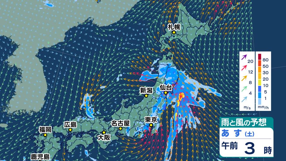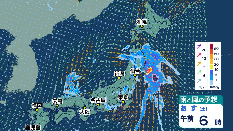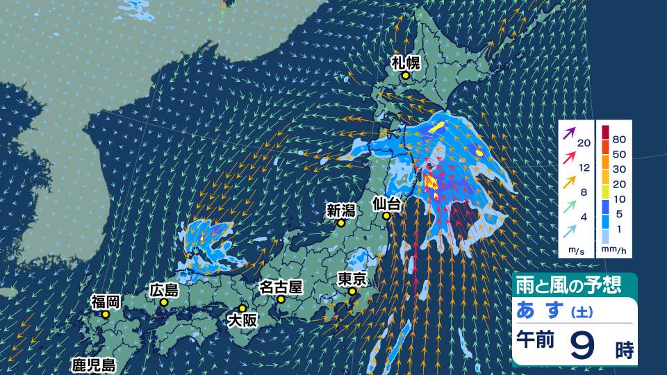 また、東北地方ではあす9日にかけて、台風から変わる熱帯低気圧周辺の暖かく湿った空気が流れ込むため、非常に激しい雨が降り、大雨となるおそれがありあす。