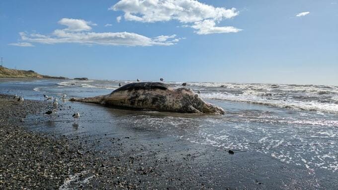 クジラは、体長およそ12メートル、腐敗が進み、骨の一部が見られる状態で、海岸に打ち上げられていたということです。