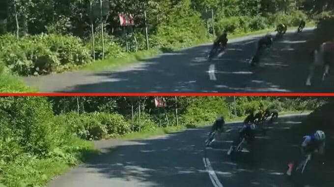 さらに、映像には、追い越しをかけたわけではないのに、猛スピードもあってか、センターラインからはみ出したり、センターライン上を走ったりする自転車が相次ぎ、セイフティーネットとして、反対車線の通行規制が必要だったことが伺えます。