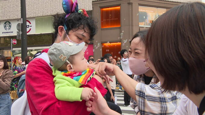 曇り空へ舞う虹色のシャボン玉は、自分らしく生きていきたいという多くの人たちの思いを映し出しているようでした。