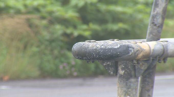 乗用車は、中央分離帯の鉄の支柱に衝突