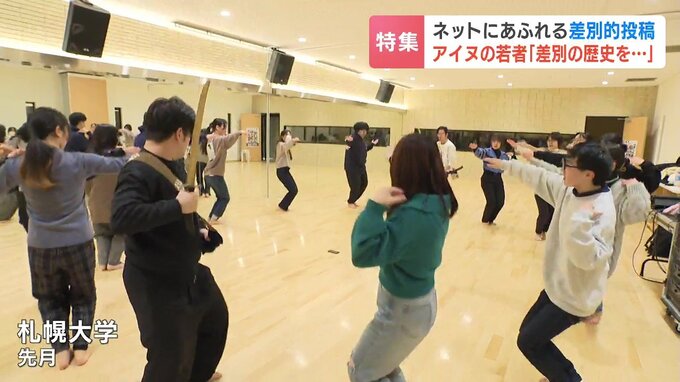 先月、アイヌの伝統舞踊を練習する学生たち。