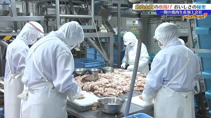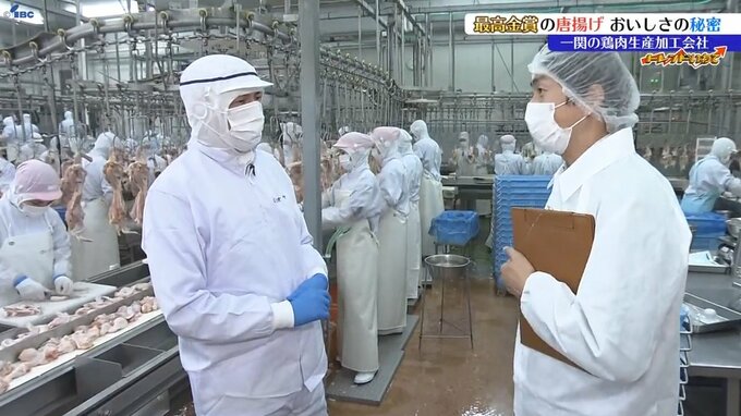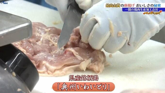 次に訪ねたのが、室根からあげに使用している鶏肉を生産する工場です。生産されているのは県産銘柄鶏の奥州いわいどり。室根からあげには、このモモ肉を使用します。