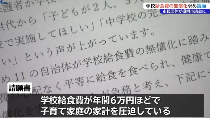 請願書によりますと、学校給食費は年間6万円ほどで子育て家庭の家計を圧迫しているとして、2023年10月に盛岡市議会で採択された「小中学校の完全給食の実施と学校給食の無償化を求める請願」の早期実現に向けスケジュールを明確にすることを求めています。