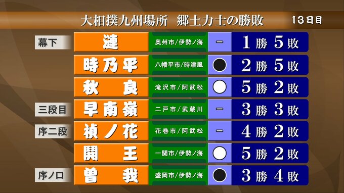 大相撲九州場所13日目、郷土力士の取り組みの結果です。