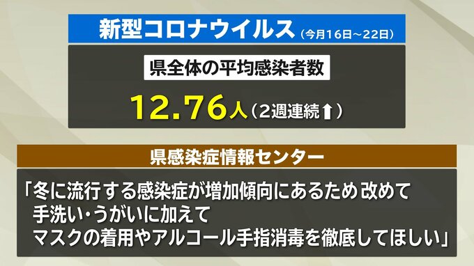 県感染症情報センターは「冬に流行する感染症が増加傾向にあるため、改めて手洗い・うがいに加えてマスクの着用やアルコール手指消毒を徹底してほしい」と注意を呼びかけています。