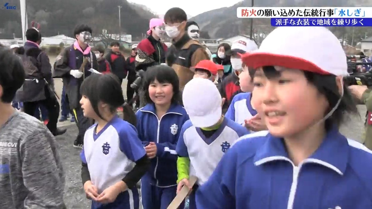 一方、こちらは防火の願いを込めた地域の伝統行事です。岩手県住田町の世田米地区におよそ200年前から伝わる、派手な衣装を身につけた人々が地域を回る「水しぎ」が24日行われました。