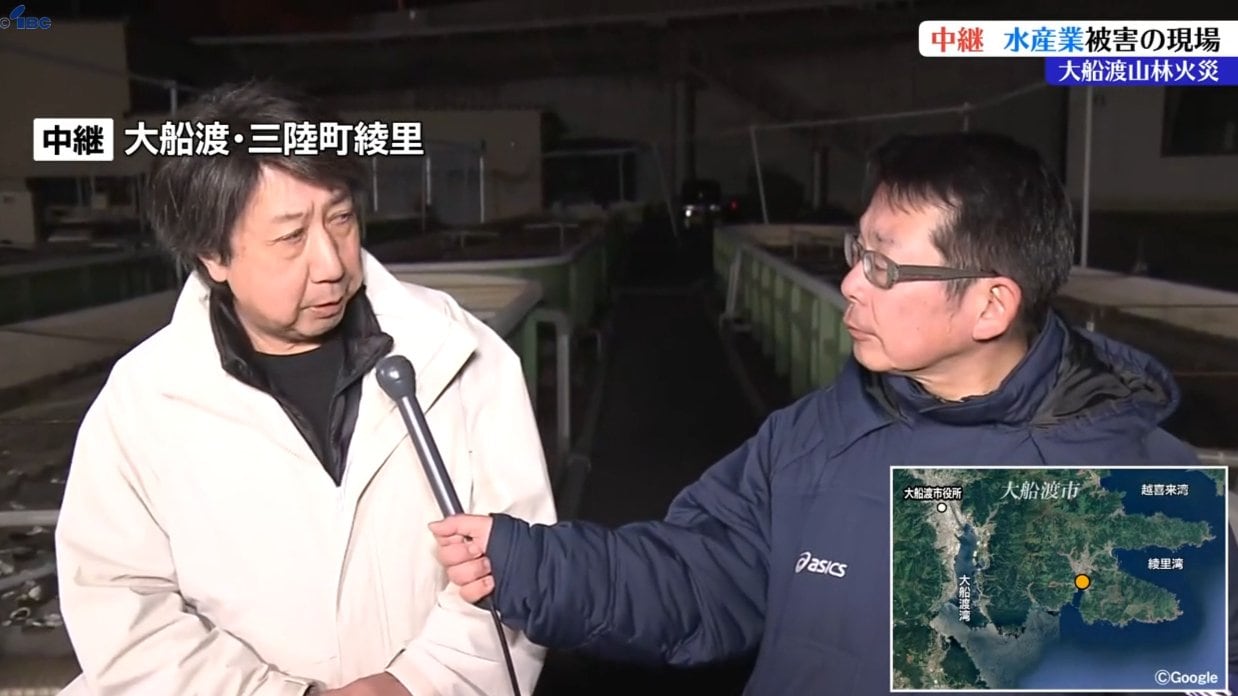 大船渡市の山林火災では東日本大震災で被災した水産業が再び被害を受けました。現場から江幡記者の中継です。