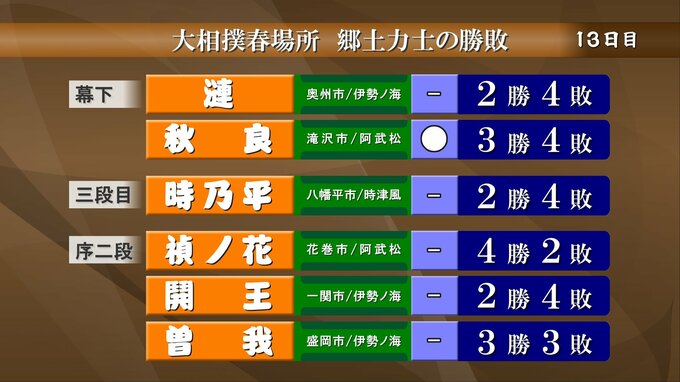 錦木は御嶽海に寄り切りで敗れ2勝11敗 大相撲春場所13日目 郷土力士の勝敗 2025年3月21日(金) 17:33 国内 大相撲春場所13日目、郷土力士の取り組みの結果です。 盛岡市出身、東前頭10枚目の錦木は御嶽海に寄り切りで敗れました。 これで2勝11敗です。 幕下の秋良は勝って3勝4敗で今場所を終えました。 その他の郷土力士の取り組みはありませんでした。