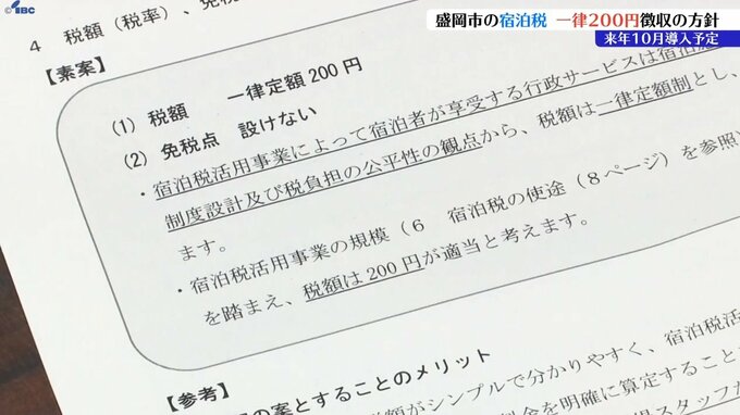 盛岡市、2026年10月の導入を目指す宿泊税について「一律200円徴収」の素案示す 2025年3月24日(月) 19:12 国内 盛岡市が来年10月の導入を目指している宿泊税について、市は1泊あたり一律で200円を徴収する素案を公表しました。これは、24日市役所で開かれた外部の有識者で構成される検討委員会で示されたものです。市は2024年1…