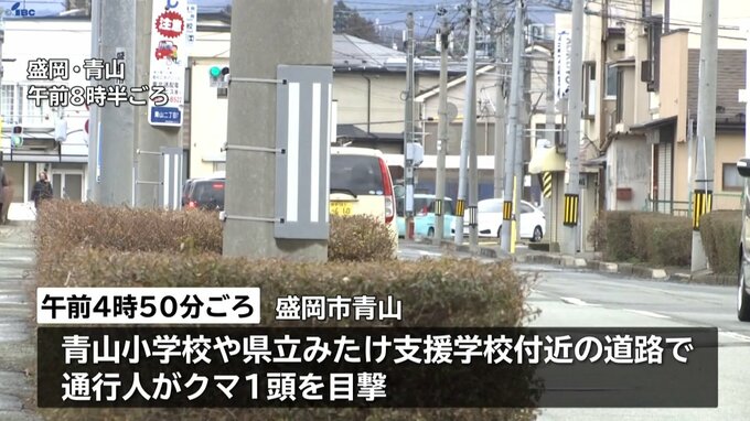 警察によりますと、2日午前4時50分ごろ、盛岡市青山の青山小学校や県立みたけ支援学校付近の道路で通行人がクマ1頭を目撃しました。