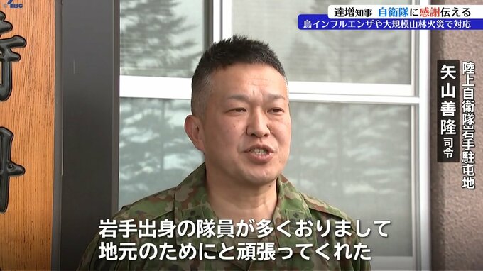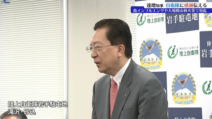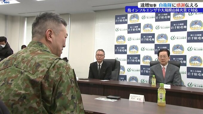 達増拓也岩手県知事は陸上自衛隊岩手駐屯地を訪れ、鳥インフルエンザや大規模山林火災への自衛隊の対応に、県民を代表して感謝を伝えました。