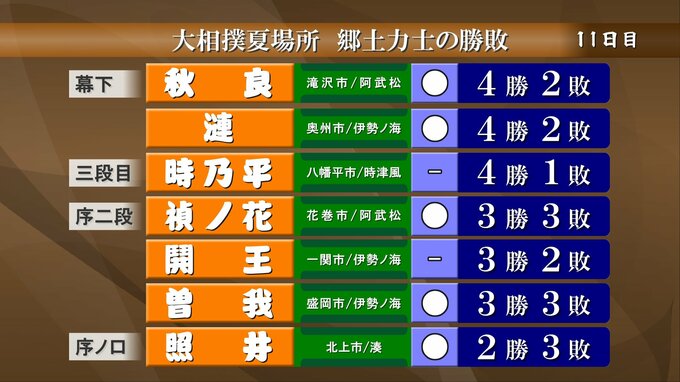 大相撲夏場所11日目、郷土力士の取り組みの結果です。きのう星が五分に戻った盛岡市出身、西前頭16枚目の錦木は、阿武剋に寄り切りで敗れましたこれで6連敗で黒星先行です。あすは時疾風との取り組みです。
