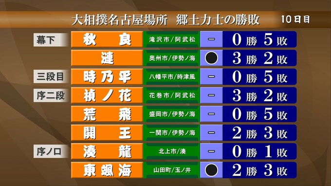 大相撲名古屋場所10日目、郷土力士の取り組み結果です。