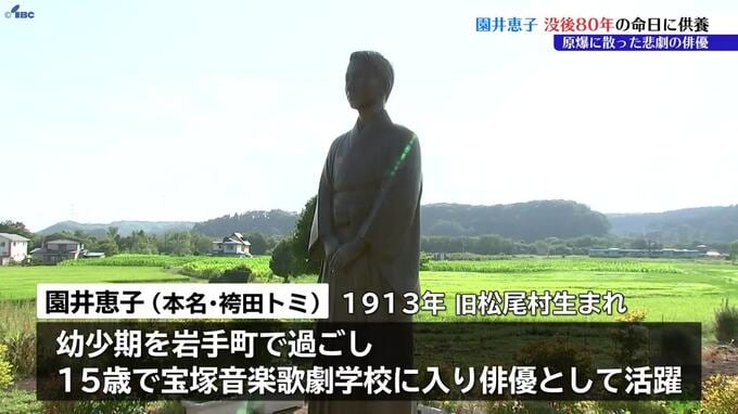 園井恵子、本名・袴田トミは、1913年8月6日に旧松尾村に生まれ、幼少期を岩手町で過ごし、15歳で宝塚音楽歌劇学校に入ると、俳優として活躍します。退団後は映画の世界にも活躍の場を広げていた園井は1945年8月6日、参加していた移動演劇隊の公演先の広島で被爆。その半月後に原爆症で亡くなりました。32歳でした。